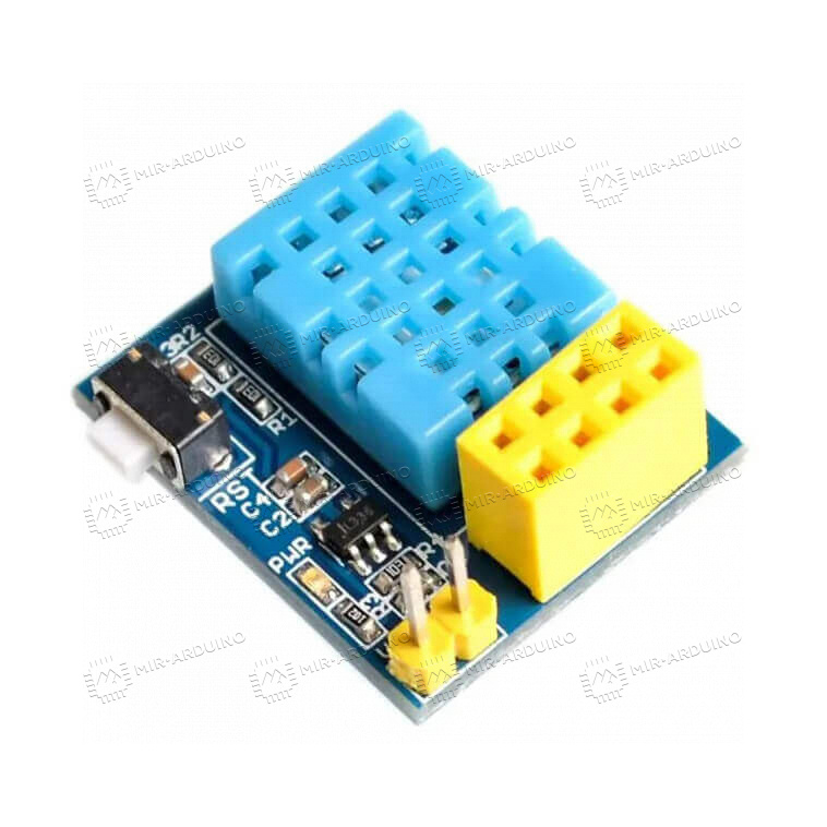 Датчик влажности и температуры DHT11 для DIY-проектов, умный дом, wi-fi ESP-01S предназначен для реализации умных климатических систем на платформе Ардуино. Работает на базе передающего устройства-контроллера ESP-01s и датчика DHT11, который собирает данные. Имеет небольшие размеры, поэтому легко интегрируется в любые климатические системы. Работает от 3,5-5,5 В, на плате есть стабилизатор напряжения. Есть кнопка перезагрузки микроконтроллера RESET. Измеряет влажность от 20% до 80% с погрешностью менее 5%, а также температуру от 0°С до 50°С с точностью до 2°С.